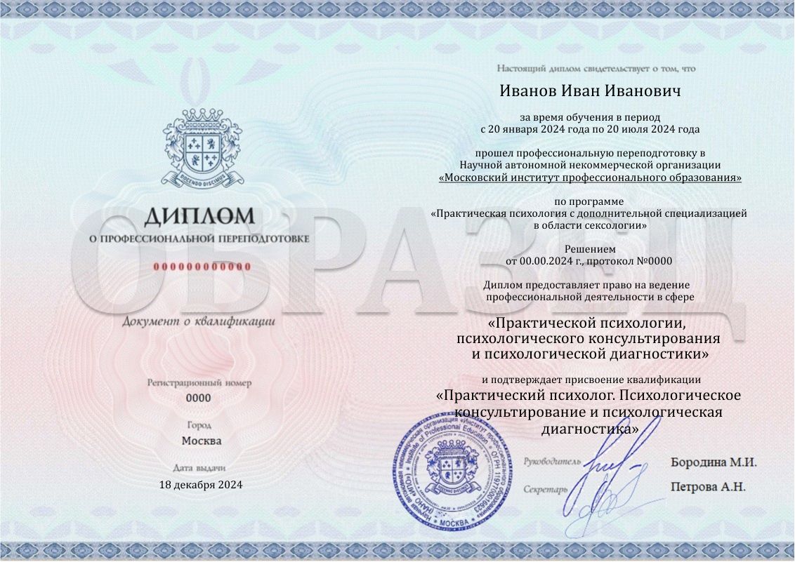 После успешного прохождения программы вы получаете Диплом о профессиональной переподготовке установленного образца. Это официальный документ, который вносится в реестр ФИС-ФРДО и дает право на осуществление профессиональной деятельности в выбранной сфере.